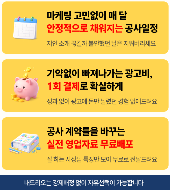 ① 인테리어 파트너 회원들은 무제한 ’인테리어 견적조회’ 서비스에서 제공되는 소비자 정보를 무료로 열람할 수 있습니다.